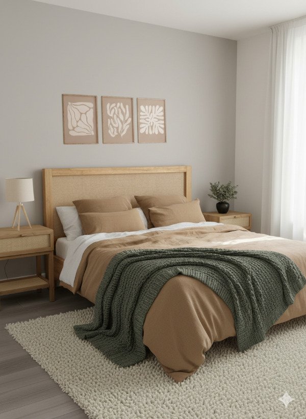Combo Dormitorio Florencia realizado en madera Oregón encerado y entelado de fibras naturales con tinte color roble claro.