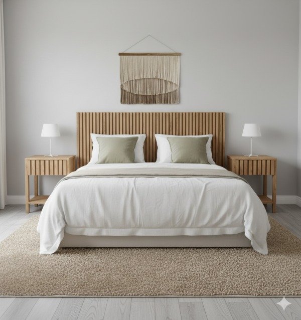 Combo Roma incluye un Respaldo varillado en madera Oregon con tinte color roble claro + 2 mesas de luz Roma.