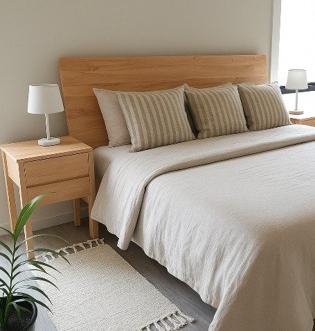 Combo incluye un respaldo en madera Oregon con tinte color roble + 2 mesas de luz con doble cajón y correderas metálicas.