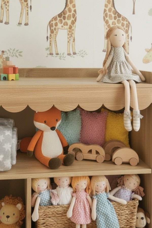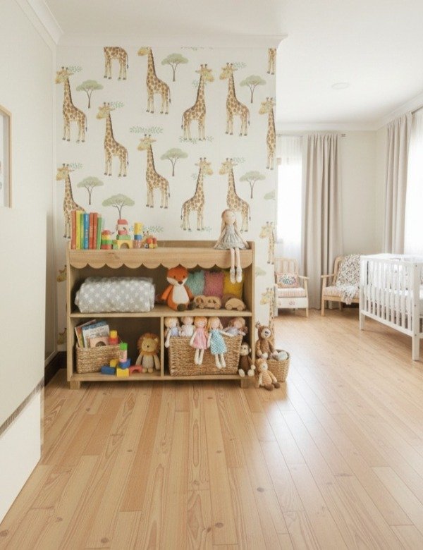 Biblioteca baja en madera Oregón con tinte color roble claro.