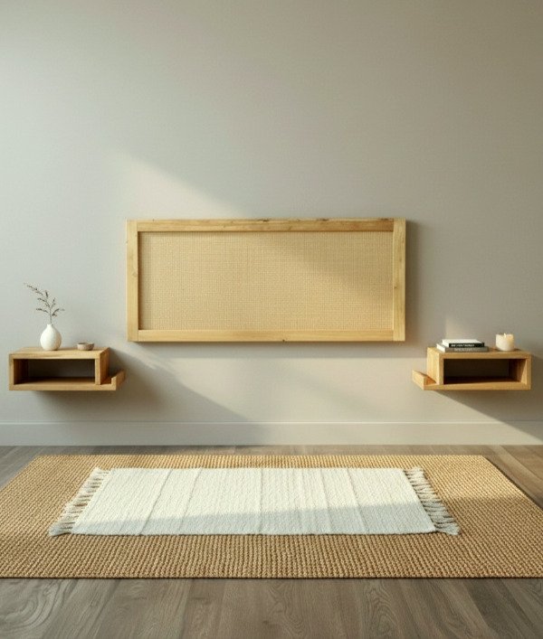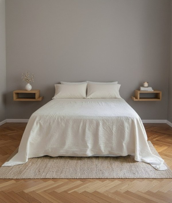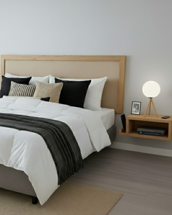 Mesa de luz flotante con estante lateral ideal para poner celular o libro. Hecha en madera Oregón con tinte color roble claro