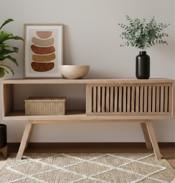Rack para tv, consola recibidor o vajillero, dale la utilidad que necesites, su diseño versátil te lo permite. Realizado en madera Oregon Con tinte color roble claro, puerta corrediza varillada.