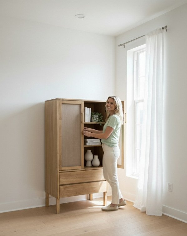 Vitrina de madera Oregon macizo teñido color roble claro.
