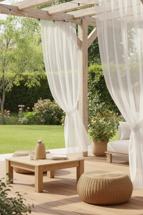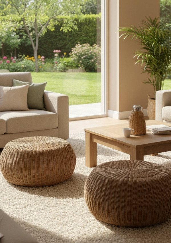 Puff circular tejido en Kraft con estructura de madera maciza.
