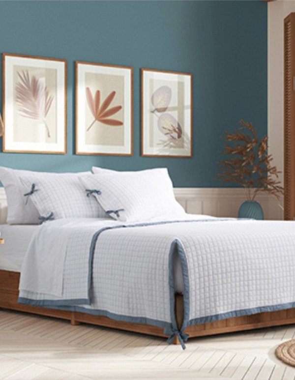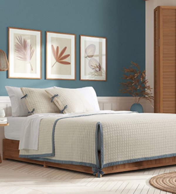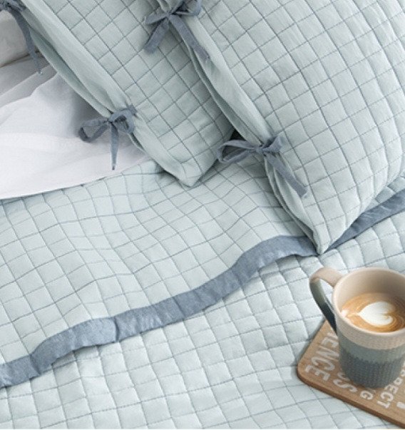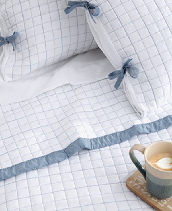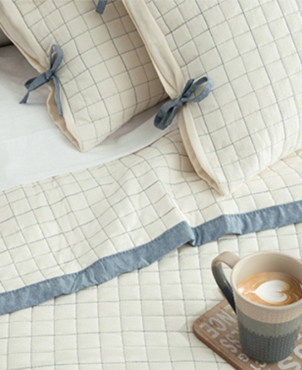 Kit cover de 3 piezas matelaseado con tratamiento prewashed con marco símil jean y cintas en cover y fundas.